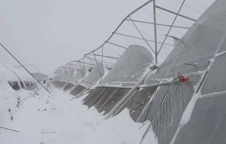 有條件的可以在草苫上加蓋一層棚膜,如沒有就將草苫卷起,置于大棚后坡,當積雪厚達8厘米左右時就會在光滑的棚膜上自動滑下。7米寬的大棚可自動滑下2/3。棚的坡度越大,自動滑下的越多。這樣可以有效緩解積雪對大棚的壓力。