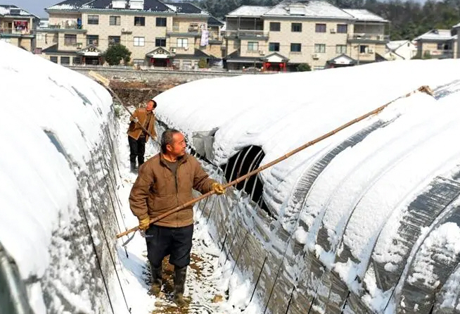 2、提前對(duì)大棚進(jìn)行加固。沿大(中)棚棚架縱向中軸線每隔2-3米用一根毛竹等支撐物對(duì)棚頂進(jìn)行支撐加固,提高大棚棚架的抗壓性,防止大雪壓倒棚。